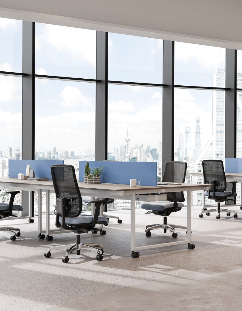 Le postazioni in bench sono state studiate per favorire il lavoro in team e il confronto diretto tra colleghi. La loro modularità, proposta in due profondità (125 e 165 cm), consente di configurare infinite possibilità di composizioni in dimensioni, finiture e soluzioni tecniche ottimizzando lo spazio. Le postazioni in bench possono essere personalizzate con schermi divisori in melaminico, rivestiti in tessuto o in vetro per garantire il giusto equilibrio tra privacy e condivisione. Agli schermi divisori è possibile agganciare diversi accessori tra cui elementi porta cancelleria, porta fogli, porta oggetti e porta documenti. Completano la famiglia Be.1 diverse soluzioni di contenitori sia indipendenti che integrati alle postazioni operative.
